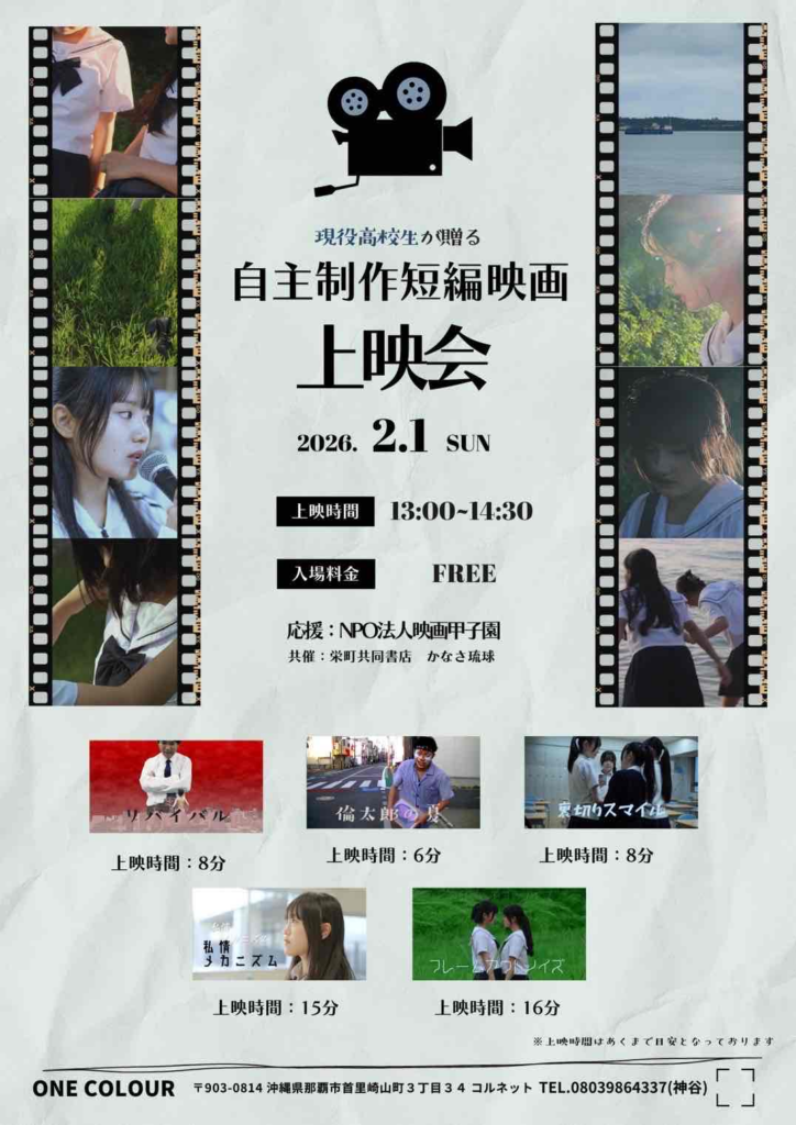2月1日に「高校生のためのeigaworldcup2025」で最優秀脚本賞と優秀撮影賞を受賞した映画作品「フレームアウトノイズ」の上映会を首里高校の皆さんが行います。場所は、ONE COLOR(沖縄県那覇市首里崎山町3丁目34コルネットビル1F)です。13時から14時半までの上映会です。無料ですのでお近くの方はぜひおいでいただきご観覧ください。 \ 最新情報をチェック /